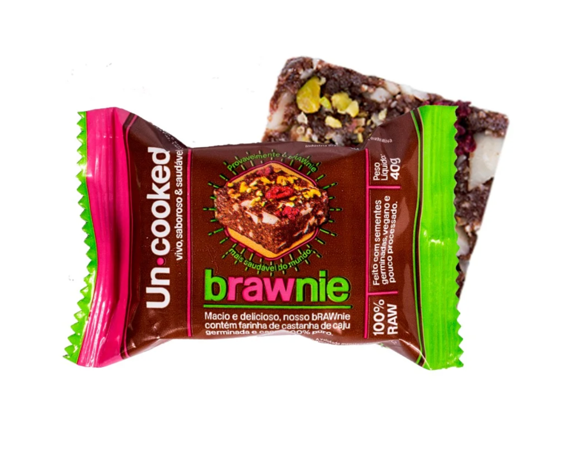 Você não leu errado, é bRAWnie mesmo. Isso porque RAW significa “cru”, sem ir ao forno. Curioso, né? Sem farinha de trigo, sem ovos, sem açúcar. No lugar deles, a farinha de castanha de caju germinada, chocolate 100% cacau, pedaços crocantes de castanha do pará e, para finalizar, um toque especial: uma farofinha de framboesa desidratda, pistache e fava de baunilha. Huuuum! O bRAWnie é o carro chefe da marca Uncooked. Sem açúcar, adoçado com tâmara, ele faz o papel de uma guloseima saudável e que podemos confiar em oferecer para as crianças e família.   Ingredientes: tâmara, farinha de castanha de caju germinada, castanha do Pará, cacau 100%, pistache, framboesa desidratada e baunilha em fava. Sem glúten | Sem lactose | Sem conservantes.